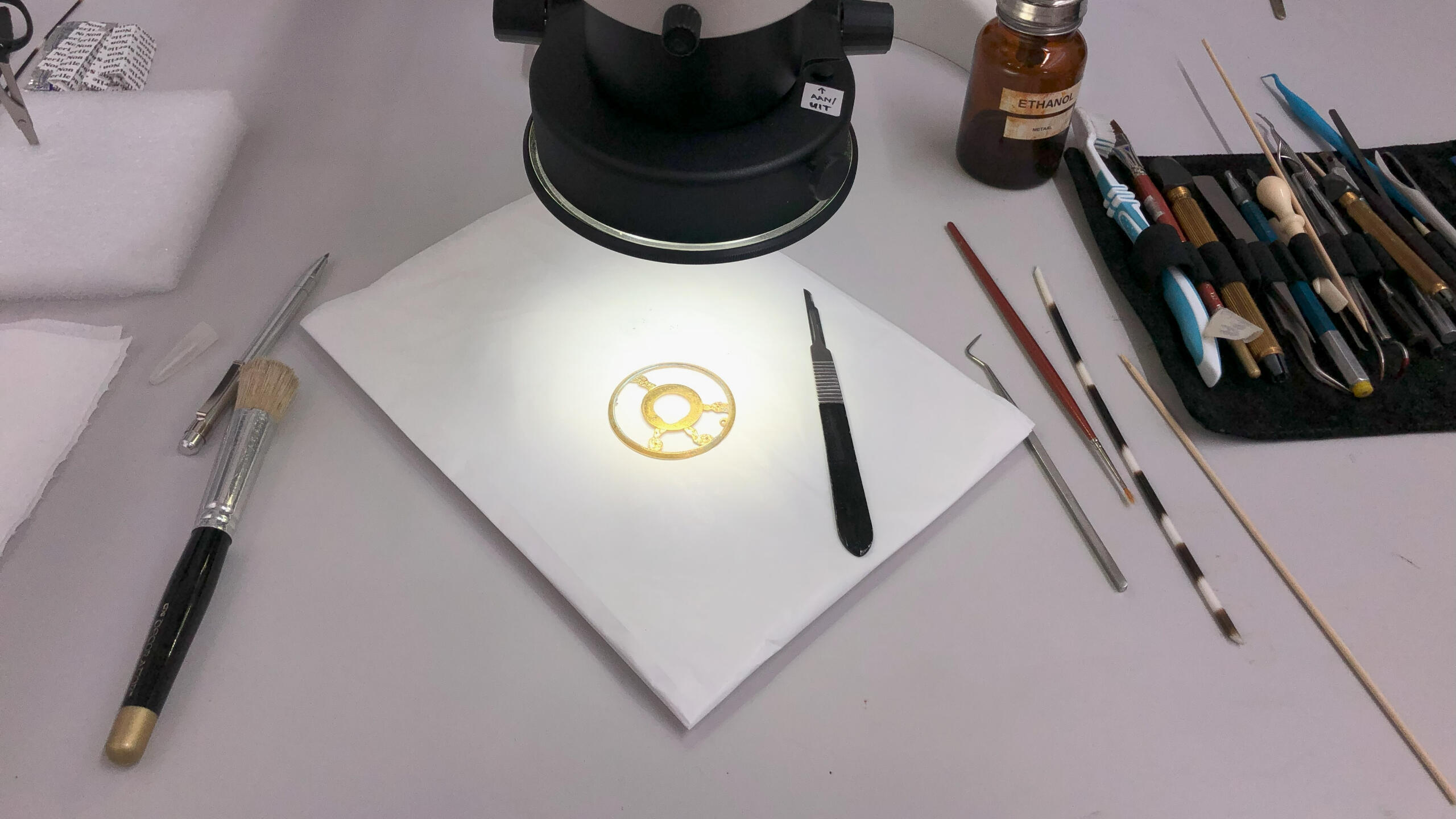 Technische en historische analyse van identificatie van materialen, productietechnieken en historische context. Voorstelvoorbereiding voor materiaalonderzoek.